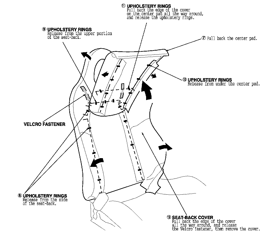 - To prevent wrinkles when installing a seat-back cover, make sure the material is stretched evenly over the pad before securing the upholstery rings, the Velcro fasteners, and the hooks.