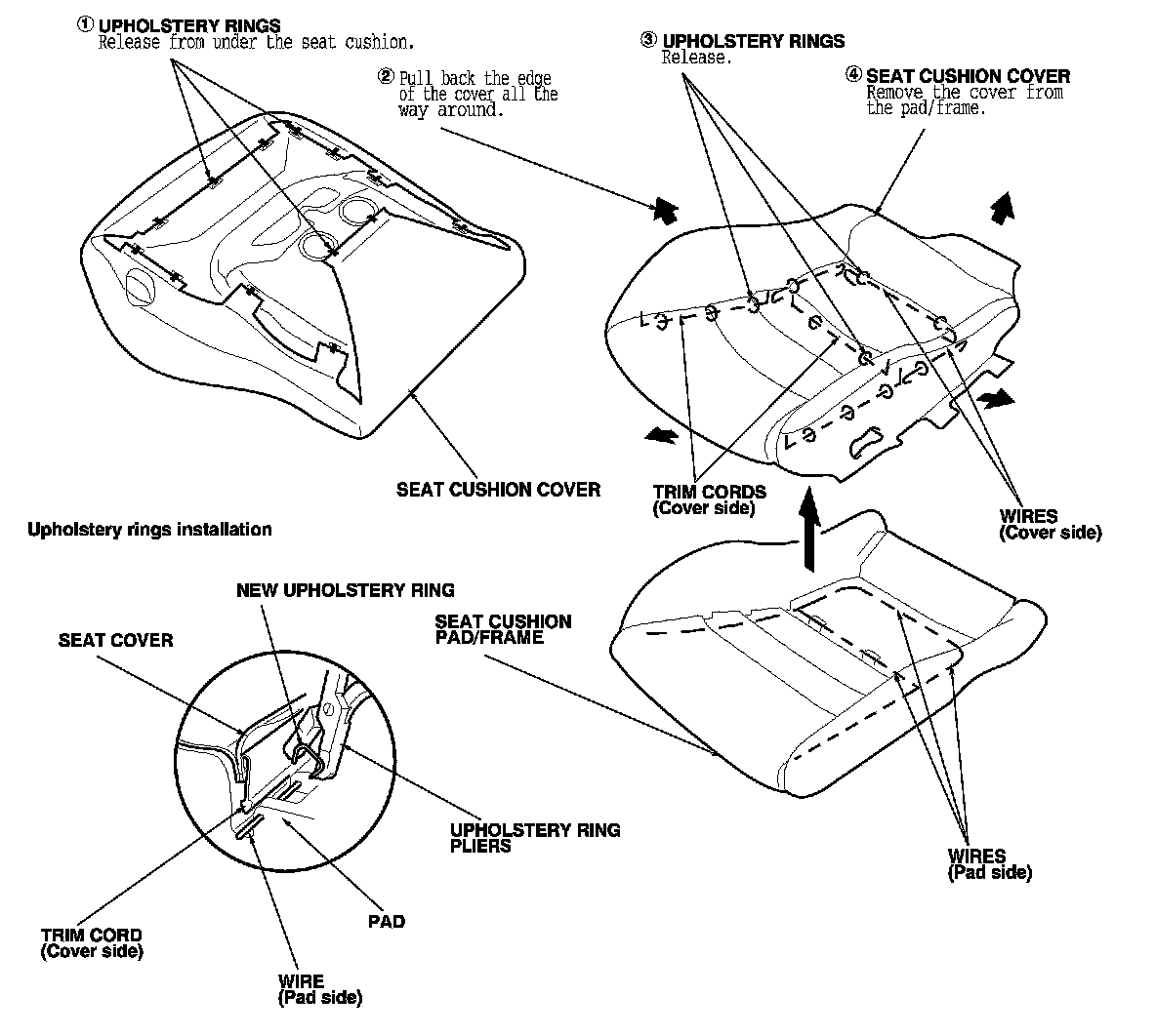 - Replace the released upholstery rings with new ones using commercially available upholstery ring pliers.