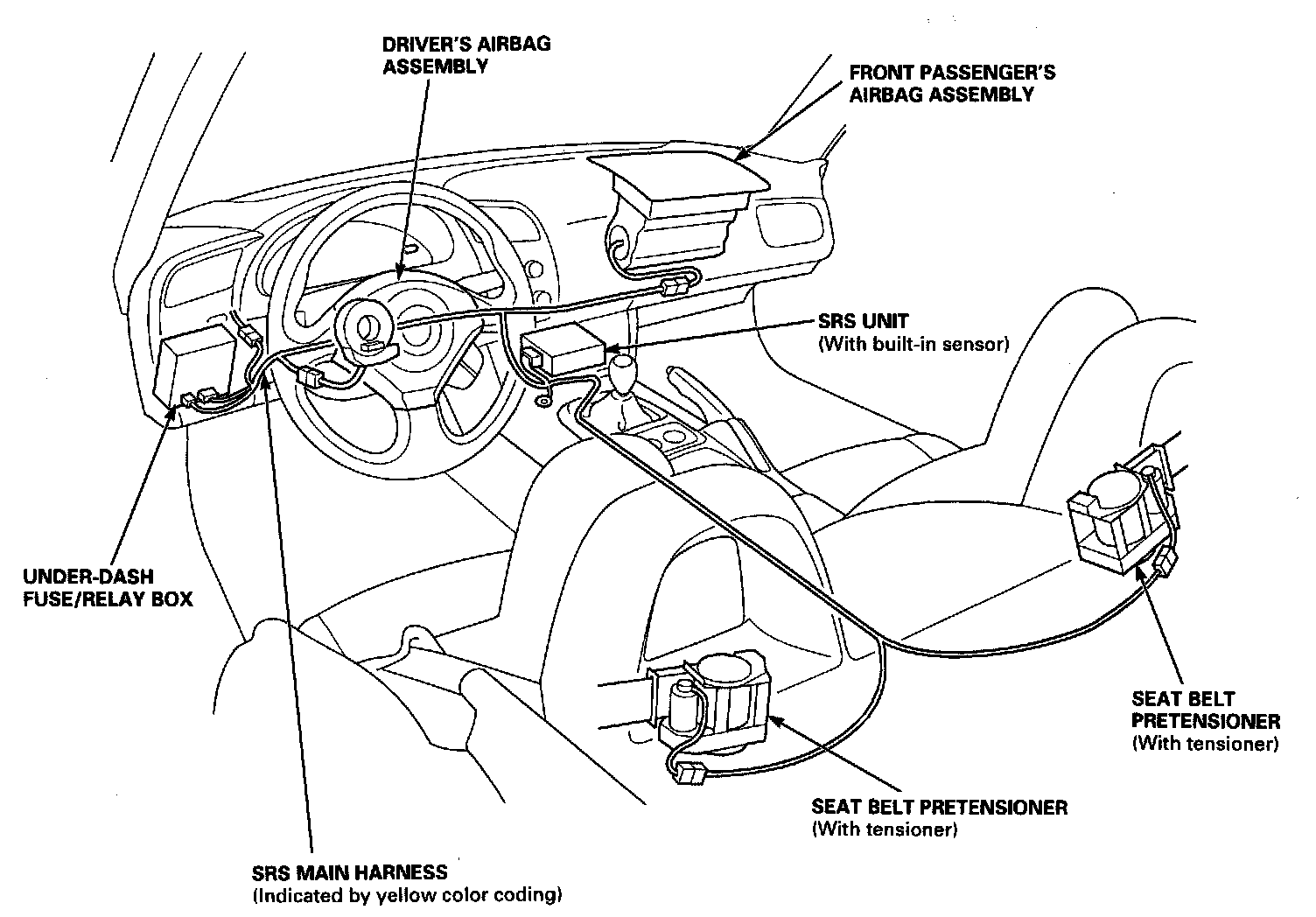 Supplemental Restraint System (SRS)This model has an SRS which include a driver's airbag located in the steering wheel hub, a passengers airbag located in the dash-board above the glove box, and seat belt tensioners located in the seat belt retractors. The SRS unit is separate from the part of the airbag assembly and has built-in sensors.