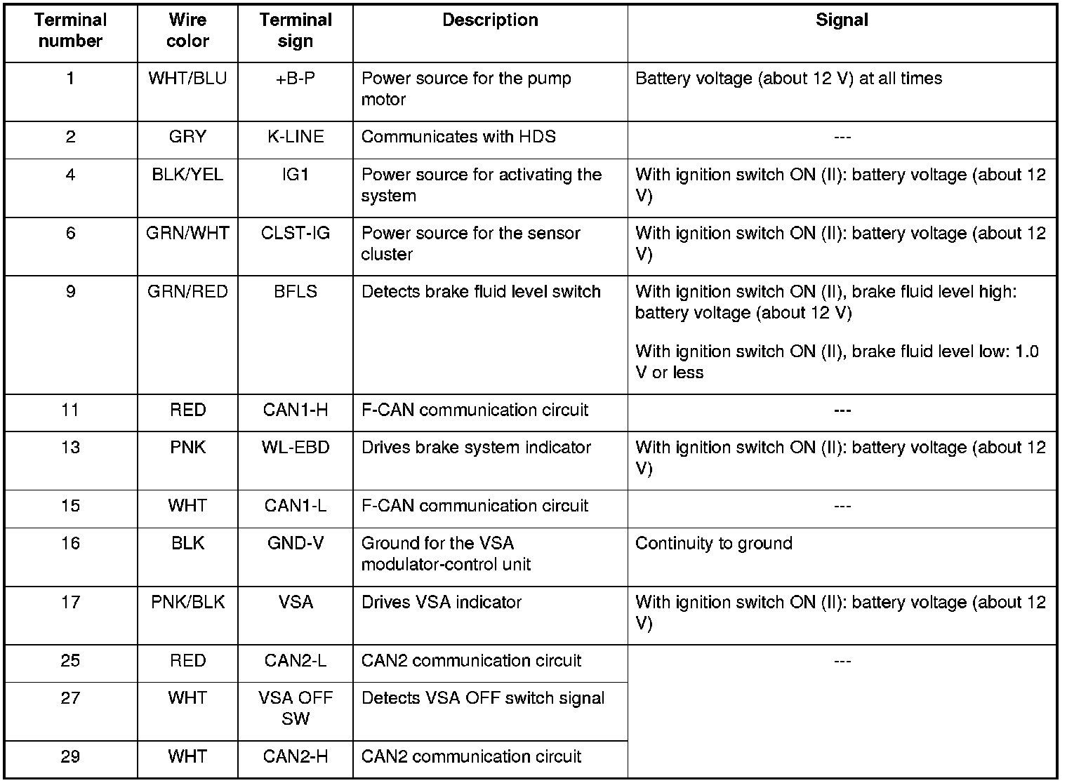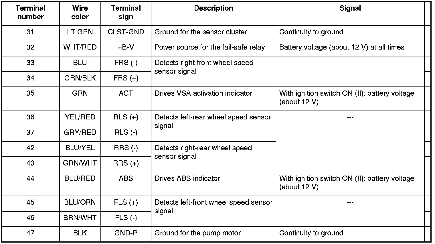 VSA Modulator-control Unit Inputs and Outputs for 47P Connector (Connector Disconnected) (cont'd)