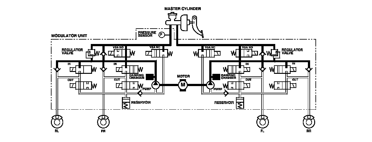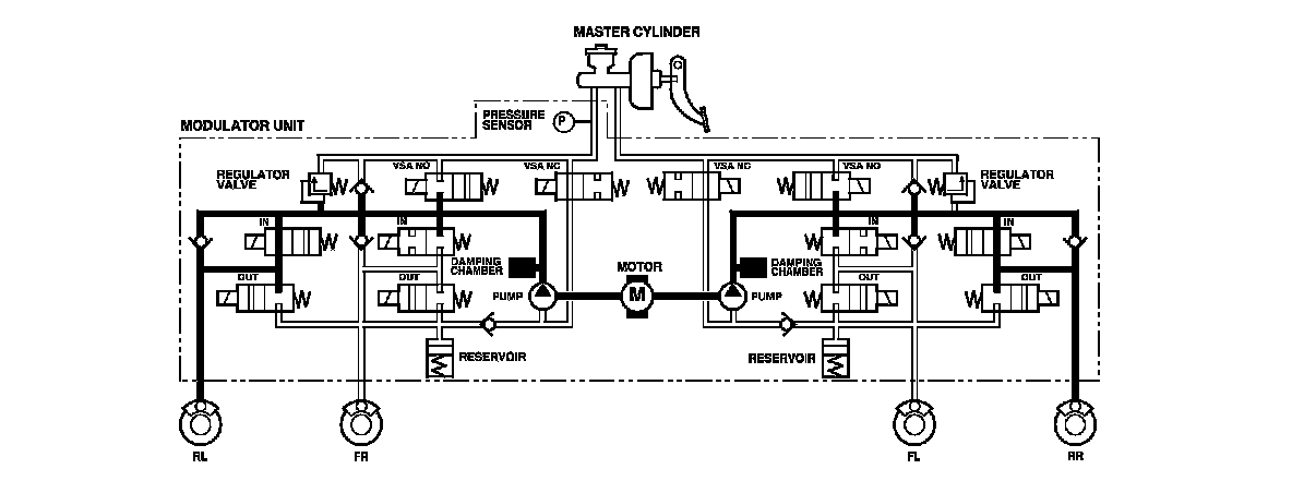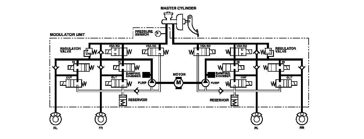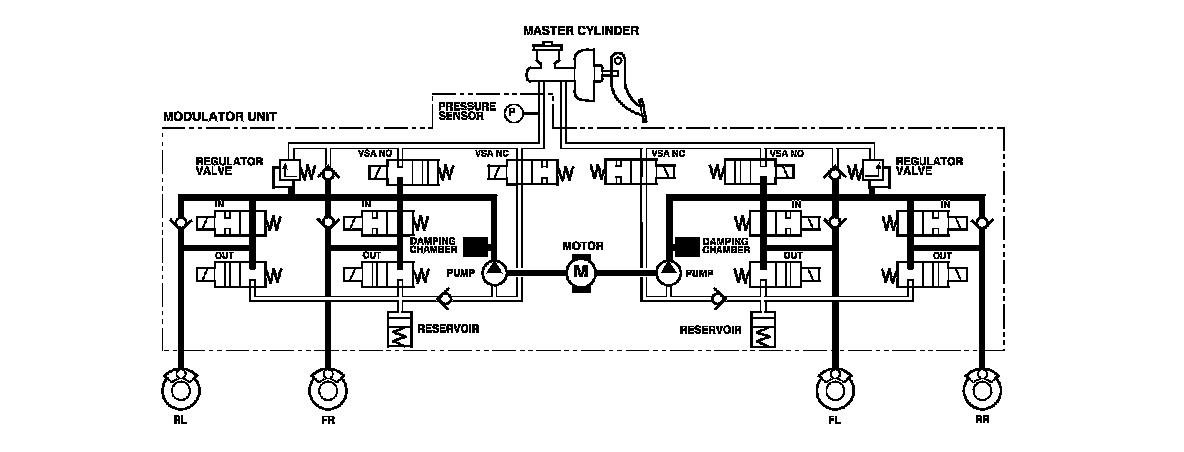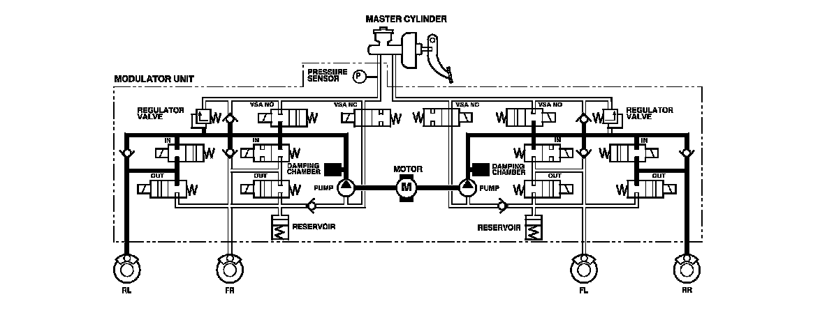The modulator unit consists of the inlet solenoid valve, outlet solenoid valve, VSA normally open (NO) solenoid valve, VSA normally closed (NC) solenoid valve, reservoir, pump, pump motor, and the damping chamber.