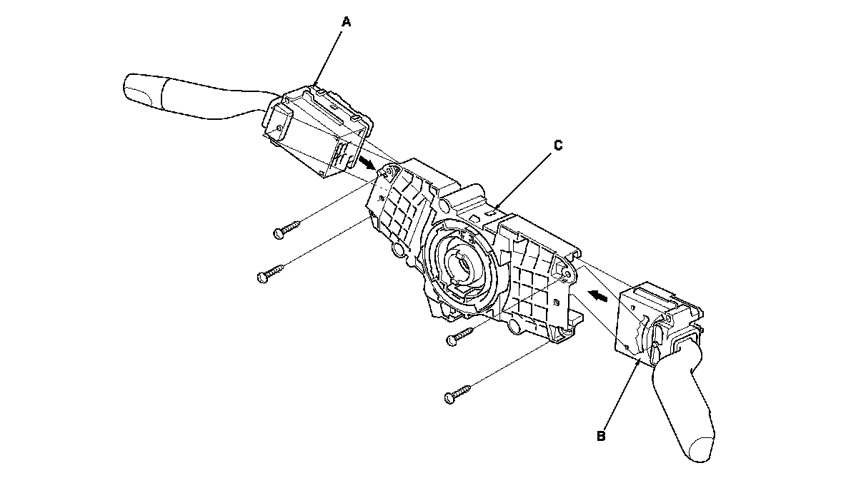4. Remove the combination light switch (A) and the wiper/washer switch (B) from the combination switch body assembly (C).