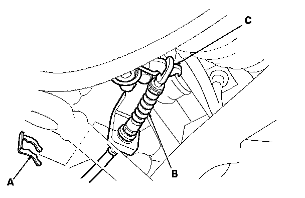 7. Disconnect the parking brake cable end from the parking brake arm (C).