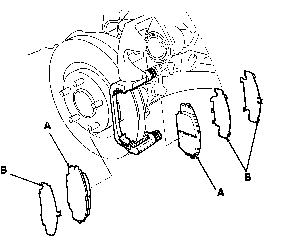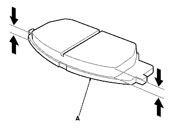 4. Using vernier calipers, measure the thickness of each brake pad lining. The measurement does not include the brake pad backing plate (A) thickness.