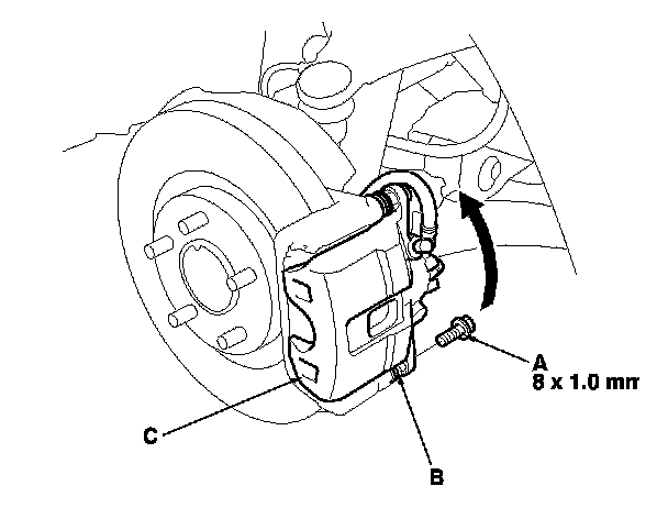 4. Remove the flange bolt (A) while holding the caliper pin (B) with a wrench. Be careful not to damage the pin boot, and pivot the caliper (C) up out of the way. Check the brake hose and pin boots for damage and deterioration.