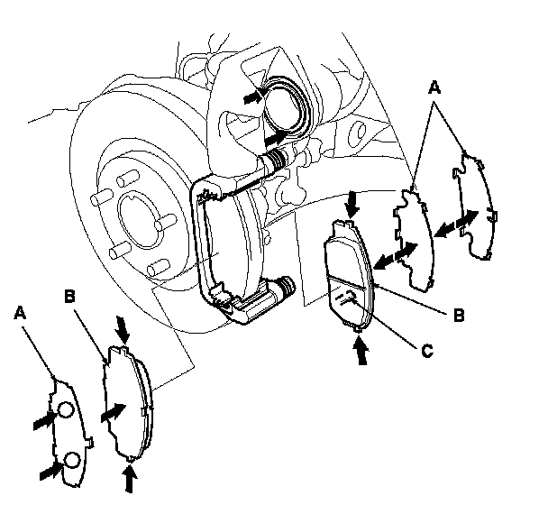 12. Install the brake pads and the pad shims correctly. Install the brake pads with the wear indicator (C) on the lower inside. If you are reusing the brake pads, always reinstall the brake pads in their original positions to prevent a momentary loss of braking efficiency.