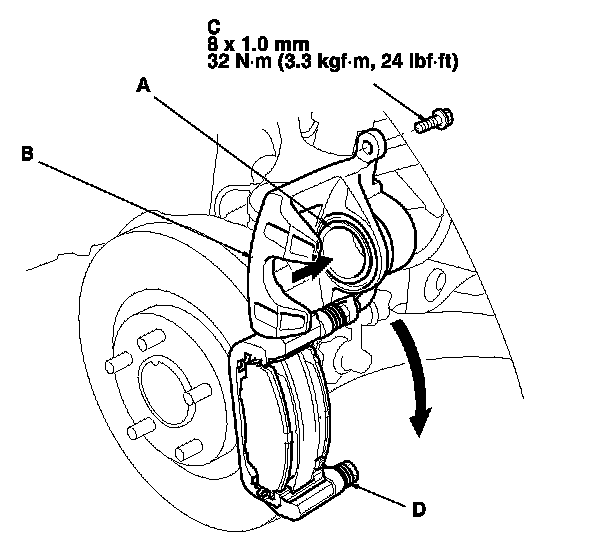 14. Pivot the caliper (B) down into position. Install the flange bolt (C), and tighten it to the specified torque while holding the caliper pin (D) with a wrench being careful not to damage the pin boot.