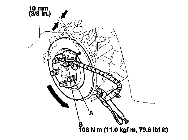 5. Install suitable flat washers (A) and wheel nuts (B), and tighten the wheel nuts to the specified torque to hold the brake disc securely against the hub.