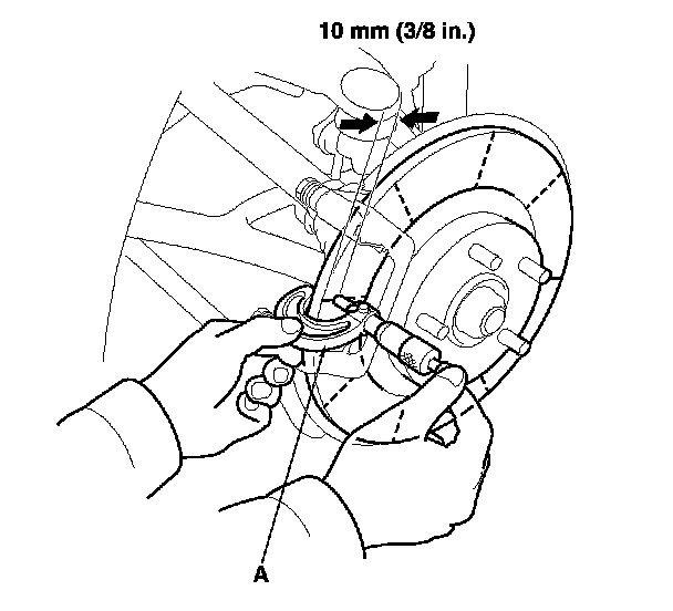 6. Set up the dial gauge against the brake disc as shown, and measure the runout at 10 mm (3/8 in.) from the outer edge of the brake disc.