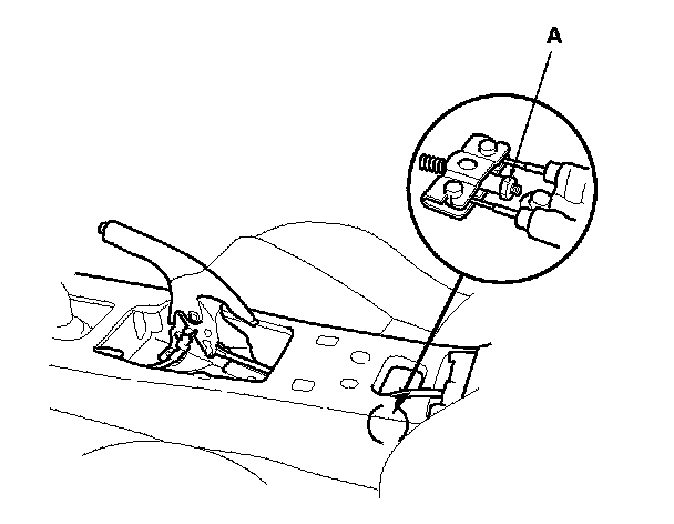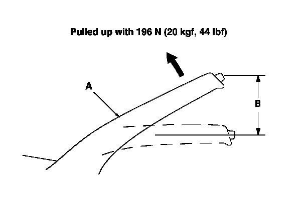 1. Pull the parking brake lever (A) with 196 N (20 kgf, 44 lbf) of force to fully apply the parking brake. The parking brake lever should be locked within the specified number of clicks (B).