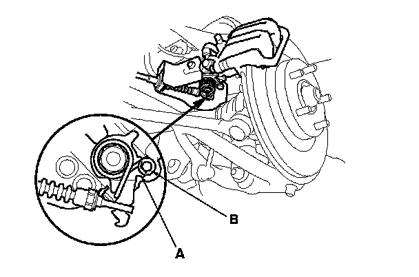 6. Make sure the lever (A) on the rear brake caliper contacts the stop pin (B).