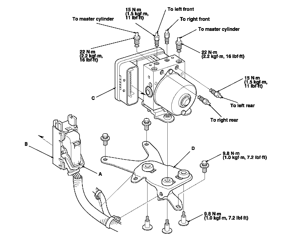 4. Remove the VSA modulator-control unit with the bracket (D) from the body.