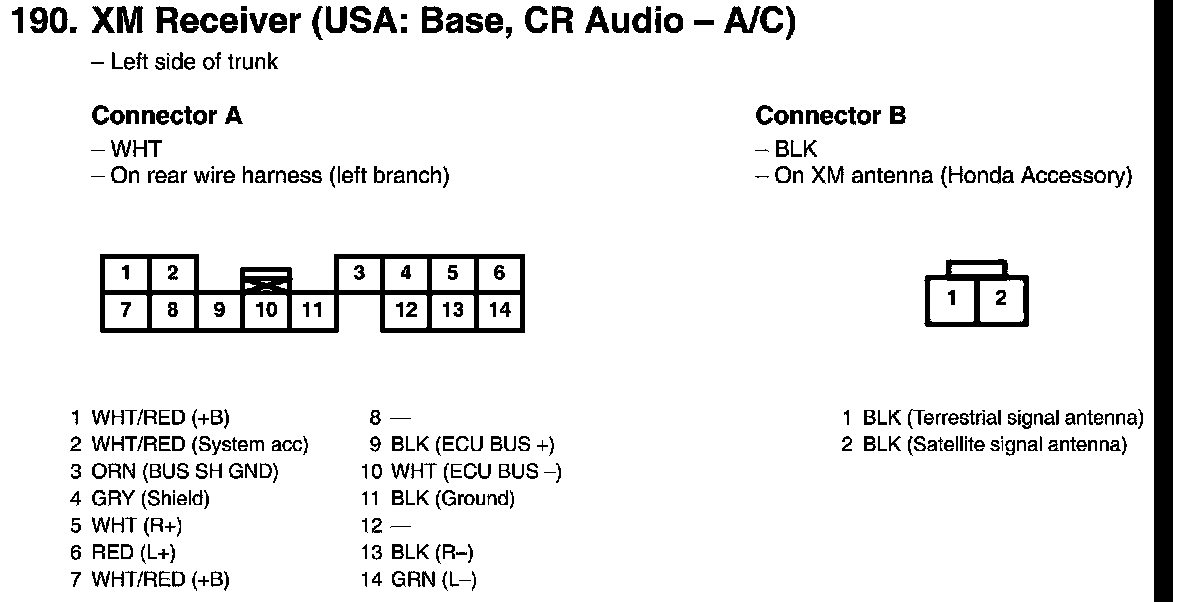 View 190 XM Receiver Connector View (USA: Base, CR Audio - A/C)