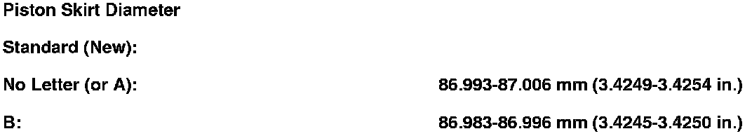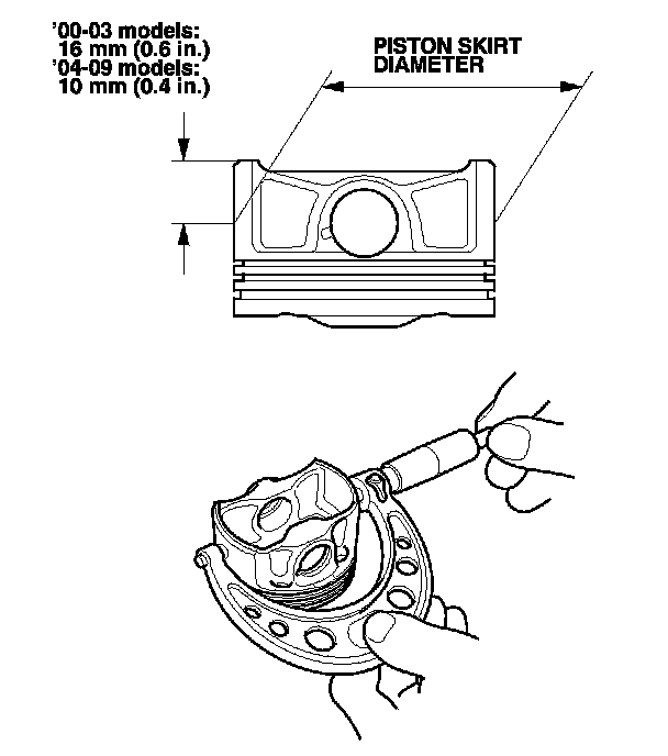 3. Measure the piston skirt diameter at a point 16 mm (0.6 in.) ('00-03 models), or 10 mm (0.4 in.) ('04-09 models) from the bottom of the skirt. There are two standard-size pistons (No Letter or A, and B). The letter is stamped on the top of the piston. Letters are also stamped on the engine block as cylinder bore sizes.