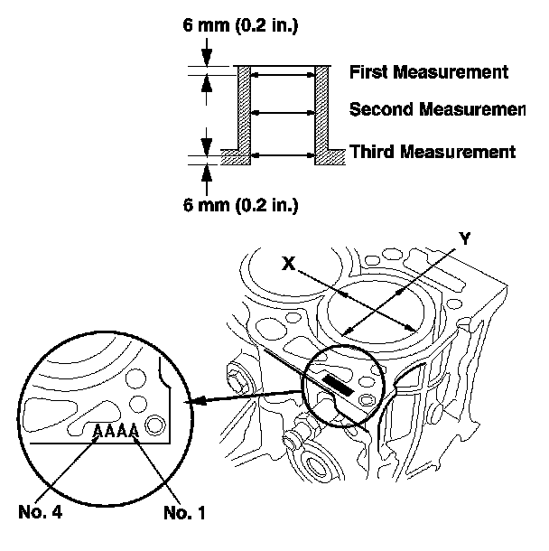 9. Measure the wear and taper in direction X and Y at three levels in each cylinder as shown. If measurements in any cylinder are beyond the oversize bore service limit, replace the engine block. If the block is to be rebored, refer to step 12 after reboring.