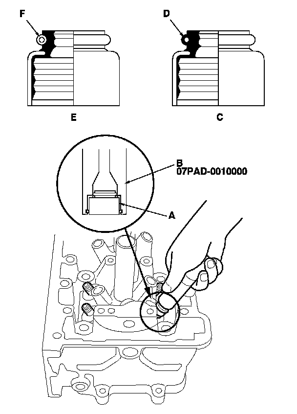 NOTE: The exhaust valve seal (C) has a black spring (D), and the intake valve seal (E) has a white spring (F). They are not interchangeable.