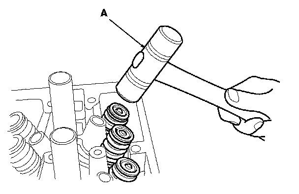 8. Lightly tap the end of each valve stem two or three times with a plastic mallet (A) to ensure proper seating of the valve and the valve cotters. Tap the valve stem only along its axis so you do not bend the stem.