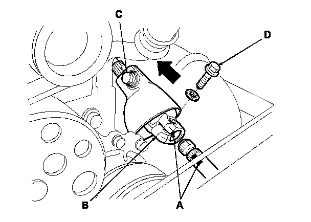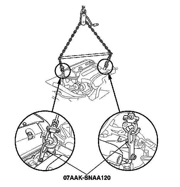 6. Attach the chain hoist to the engine as shown. Take care not to damage the rocker arm oil control valve (VTEC solenoid valve) and the wire harness.