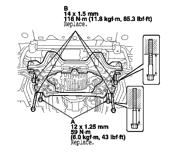 10. Loosen the four front subframe mounting bolts (B) 75 mm (3.0 in.) as shown, and lower the front subframe.