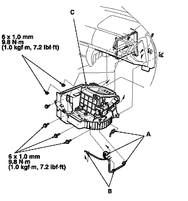 3. Disconnect the connectors (A) from the blower motor, the power transistor and the recirculation control motor, then remove the wire harness clips (B). Remove the self-tapping screw, the mounting bolts, the mounting nuts and the blower unit (C).