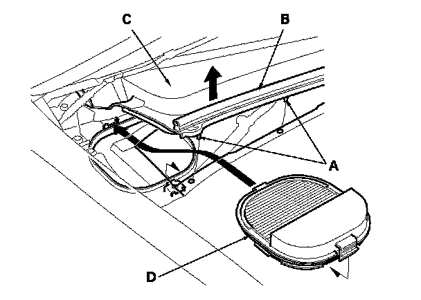 2. Remove the clips (A) and the hood seal (B). Lift the right side of the cowl cover (C) up, and remove the dust and pollen filter (D) as shown. Be careful not to damage the hood seal when removing the clips.