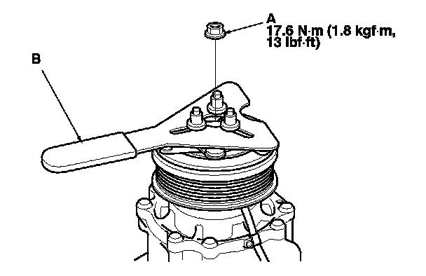 1. Remove the center nut (A) while holding the armature plate with a commercially available A/C clutch holder (B).