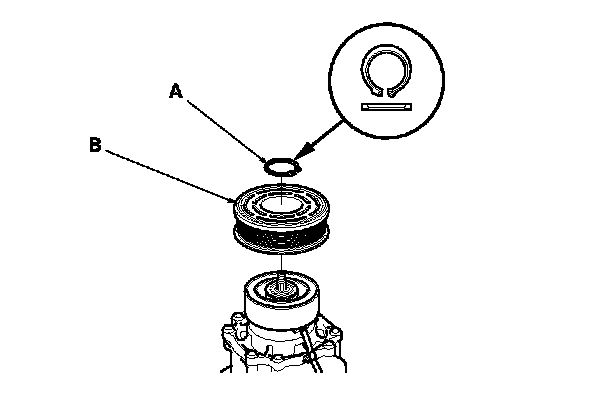 3. If you are replacing the field coil, remove the snap ring (A) with snap ring pliers, then remove the rotor pulley (B). Be careful not to damage the pulley or the A/C compressor.