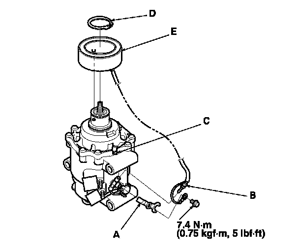 4. Remove the bolt and holder (A), then disconnect the field coil connector (B). Loosen the clamp screw (C) to free the field coil wire. Remove the snap ring (D) with snap ring pliers, then remove the field coil (E). Be careful not to damage the field coil or the A/C compressor.