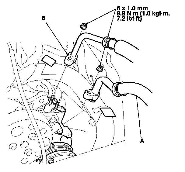 6. Remove the nuts, then disconnect the suction line (A) and the discharge line (B) from the A/C compressor. Plug or cap the lines immediately after disconnecting them to avoid moisture and dust contamination.
