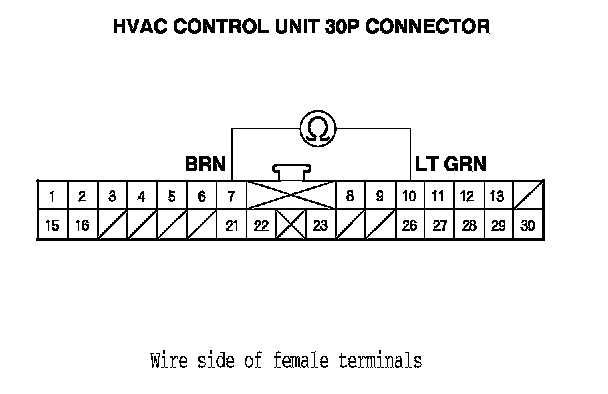 11. Measure the resistance between HVAC control unit 30P connector terminals No. 7 and No. 10.