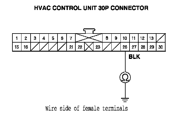 7. Check for continuity between HVAC control unit 30P connector terminal No. 26 and body ground.