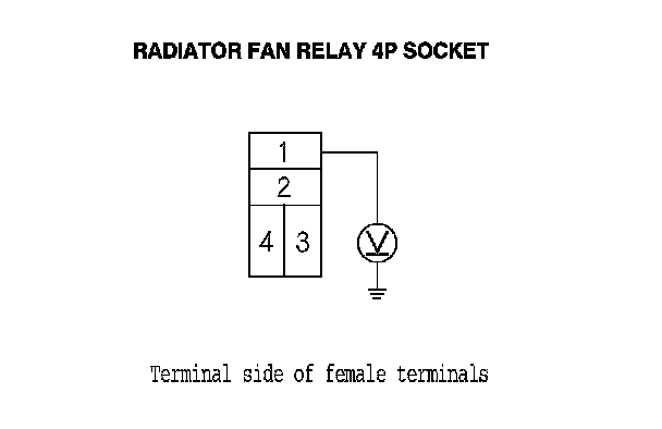 5. Measure the voltage between radiator fan relay 4P socket terminal No. 1 and body ground.