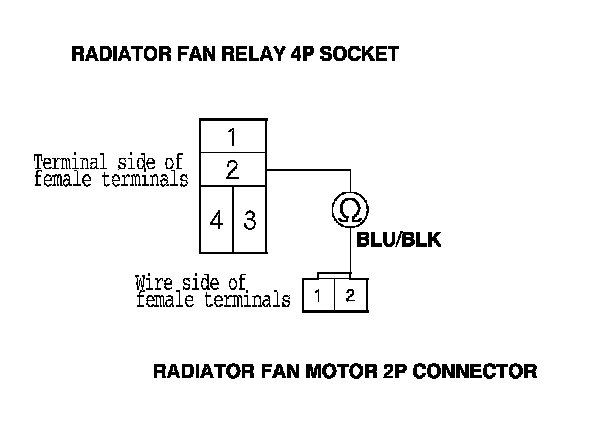 9. Check for continuity between radiator fan relay 4P socket terminal No. 2 and radiator fan motor 2P connector terminal No. 2.