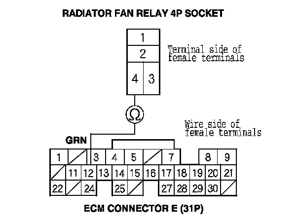 11. Turn the ignition switch to LOCK (0), then check for continuity between radiator fan relay 4P socket terminal No. 4 and engine control module (ECM) connector terminal E12.