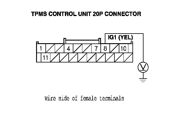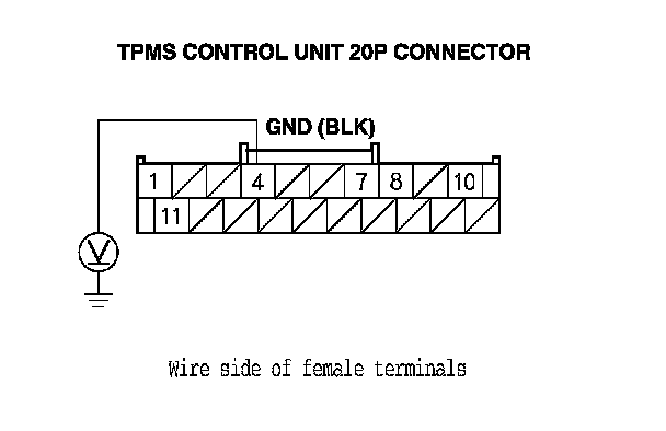 7. Measure the voltage between body ground and TPMS control unit 20P connector terminal No. 10.