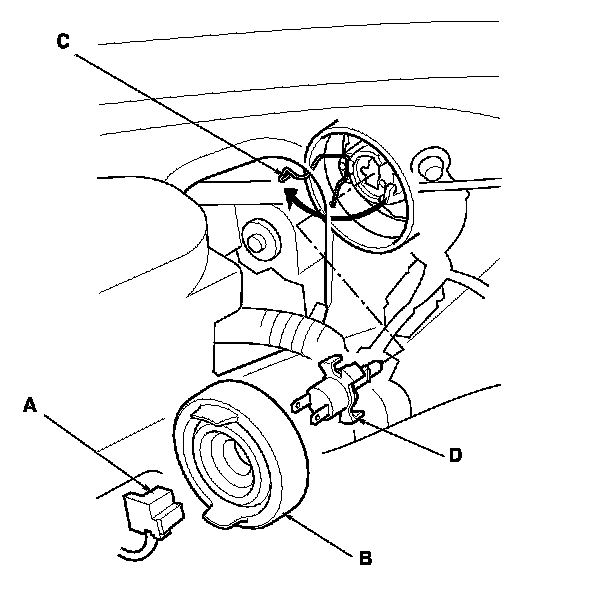 3. Pull the retaining spring (C) away from the bulb (D), then remove the bulb.