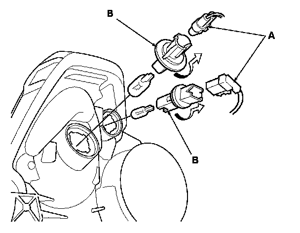 3. Turn the bulb sockets (B) 45 ° counterclockwise to remove them from the headlight housing.