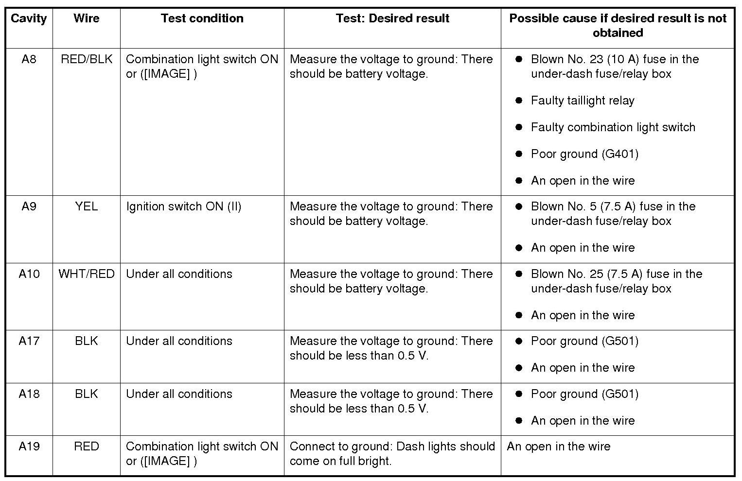 3. Reconnect the connectors to the gauge assembly, and do these input tests at the following connector.