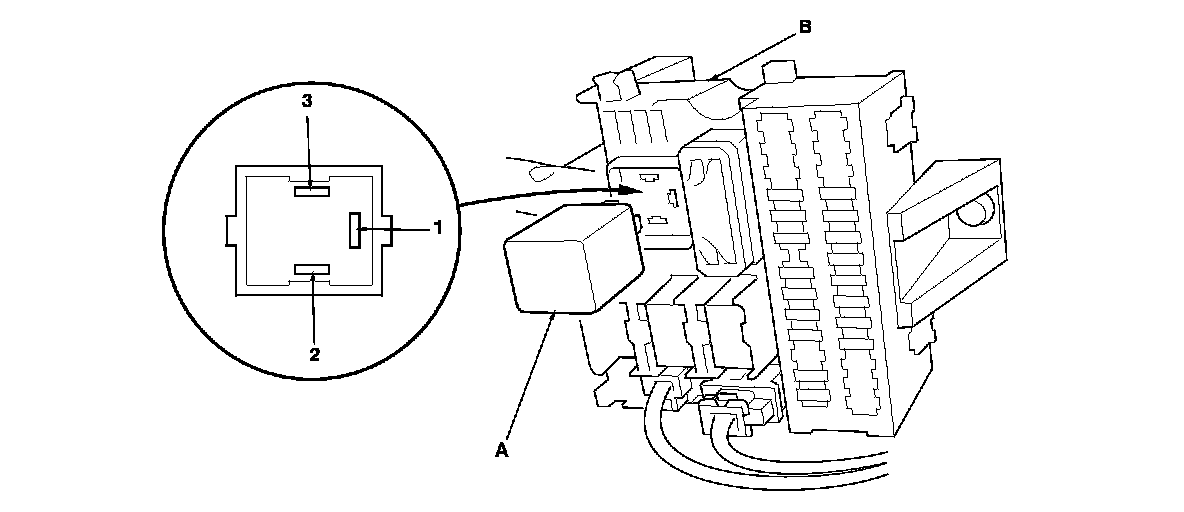 1. Remove the turn signal/hazard relay (A) from the under-dash fuse/relay box (B).