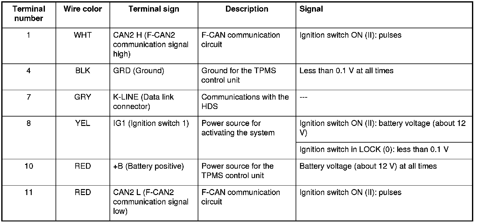 - When the vehicle is traveling more than 28 mph (45 km/h), an RF (radio frequency) band wave signal is transmitted from each tire pressure sensor to the control unit.