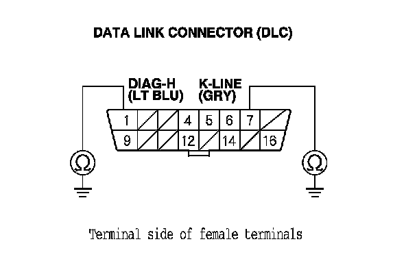 18. Check for continuity between DLC terminals No. 1 and No. 7 and body ground individually.