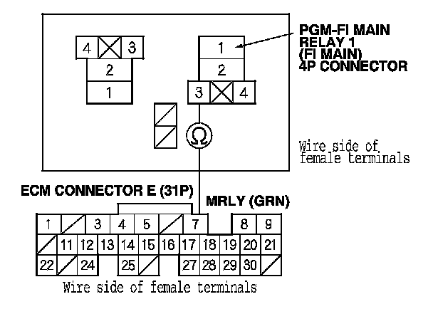 65. Check for continuity between PGM-FI main relay 1 (FI MAIN) 4P connector terminal No. 3 and ECM connector terminal E7.
