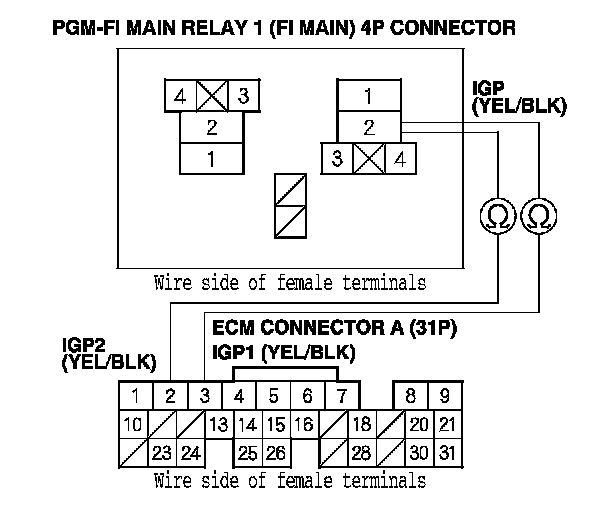 74. Check for continuity between PGM-FI main relay 1 (FI MAIN) 4P connector terminal No. 2 and ECM connector terminals A2 and A3 individually.