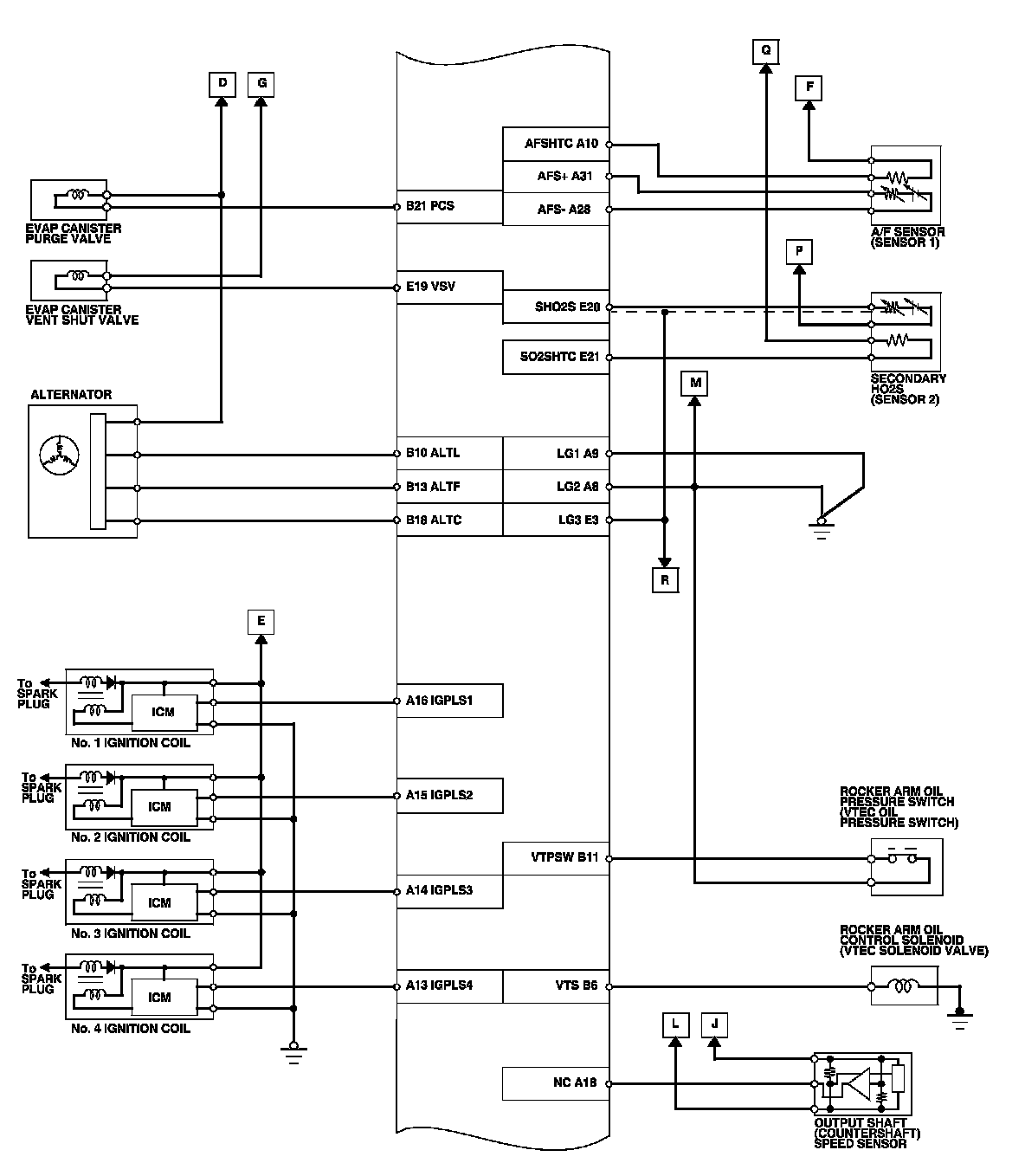 The secondary HO2S detects the oxygen content in the exhaust gas downstream of the three way catalytic converter (TWC), and sends signals to the ECM which varies the duration of fuel injection accordingly. To stabilize its output, the sensor has an internal heater. The ECM compares the HO2S output with the A/F sensor output to determine catalyst efficiency. The secondary HO2S is on the TWC.