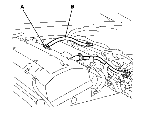 1. Check the PCV valve (A), the hoses (B), and the connections for leaks or restrictions.