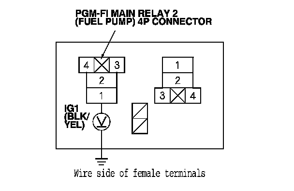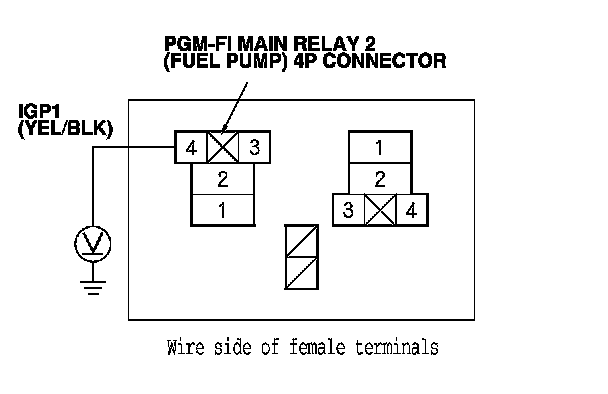 5. Measure the voltage between PGM-FI main relay 2 (FUEL PUMP) 4P connector terminal No. 1 and body ground.