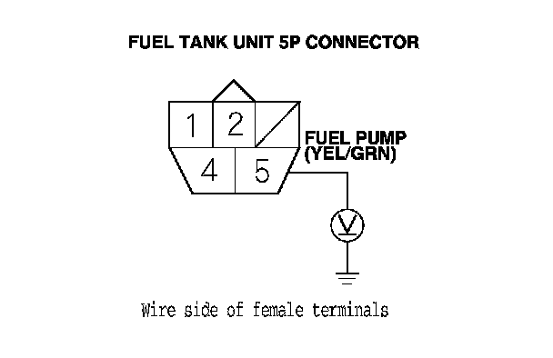28. Turn the ignition switch to ON (II), and measure the voltage between fuel tank unit 5P connector terminal No. 5 and body ground.