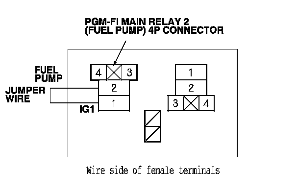 27. Connect PGM-FI main relay 2 (FUEL PUMP) 4P connector terminals No. 1 and No. 2 with a jumper wire.