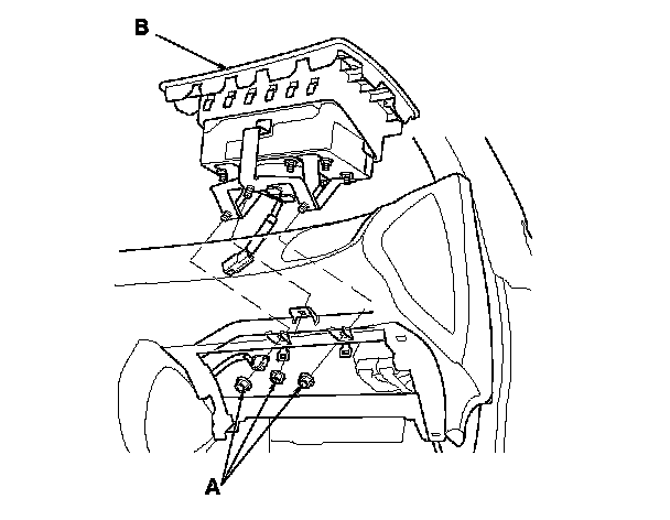 3. Remove the three mounting nuts (A) from the bracket. Cover the passenger's lid and dashboard with a cloth, and pry carefully with a screwdriver to lift the passenger's airbag assembly (B) out of the dashboard. If you are replacing the passenger's lid, go to step 4. If deployed passenger's airbag, replace a new airbag and a new lid as a set.