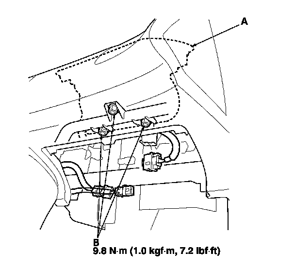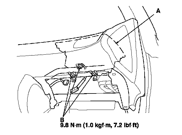 1. Place the passenger's airbag assembly (A) into the dashboard. Tighten the passenger's airbag mounting nuts (B).